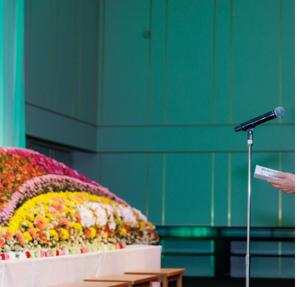 第一部では、来賓の方々より追悼のお言葉をいただきました 。会長が好きだった『木蘭の涙』のピアノとフルートの音色が会場に響き、厳かな献花の列が続きました 。